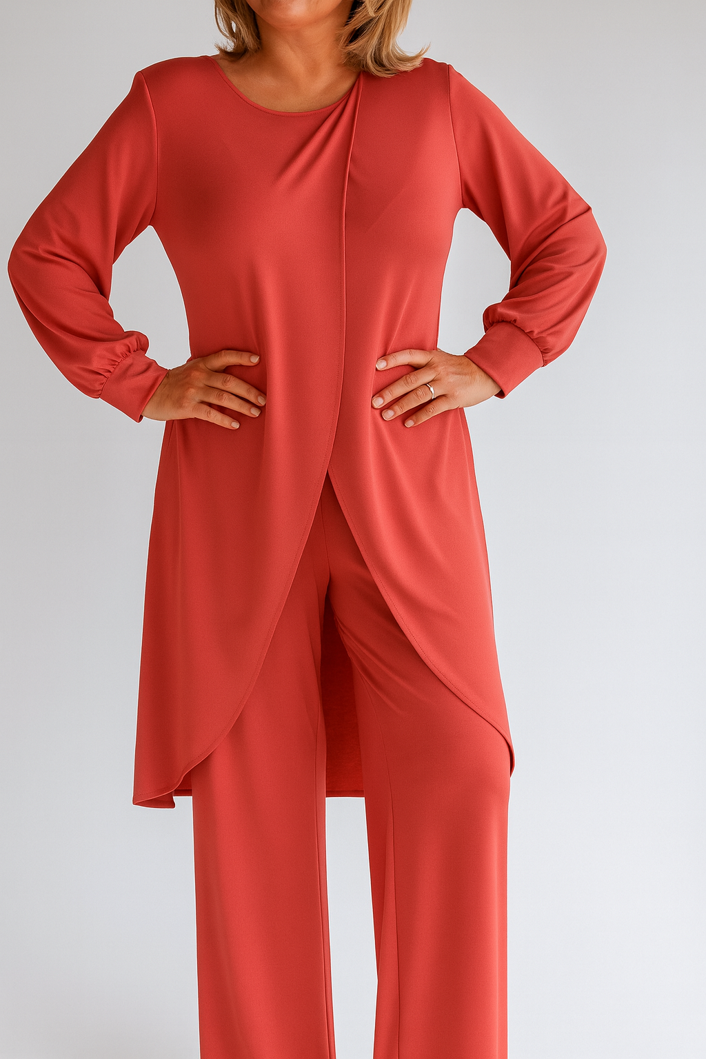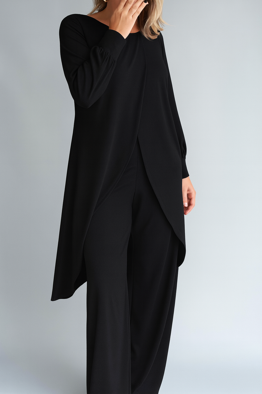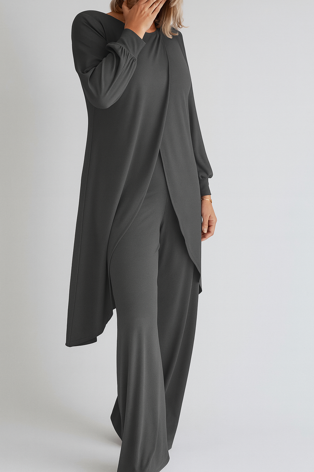 - Eleganter Crossover-Saum: Der lange, fließende Saum bietet zusätzliche Abdeckung und einen stilvollen, modernen Look.