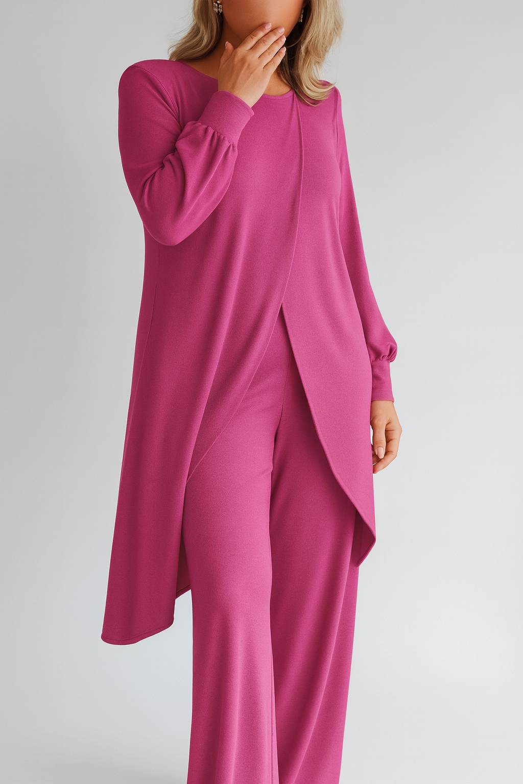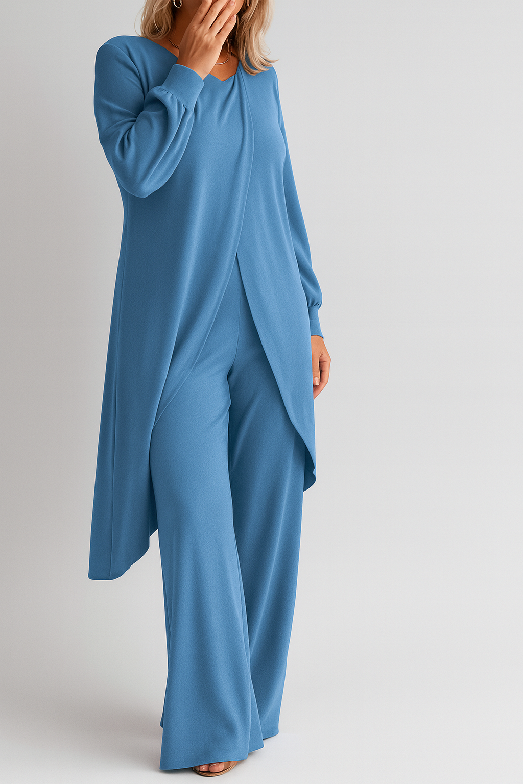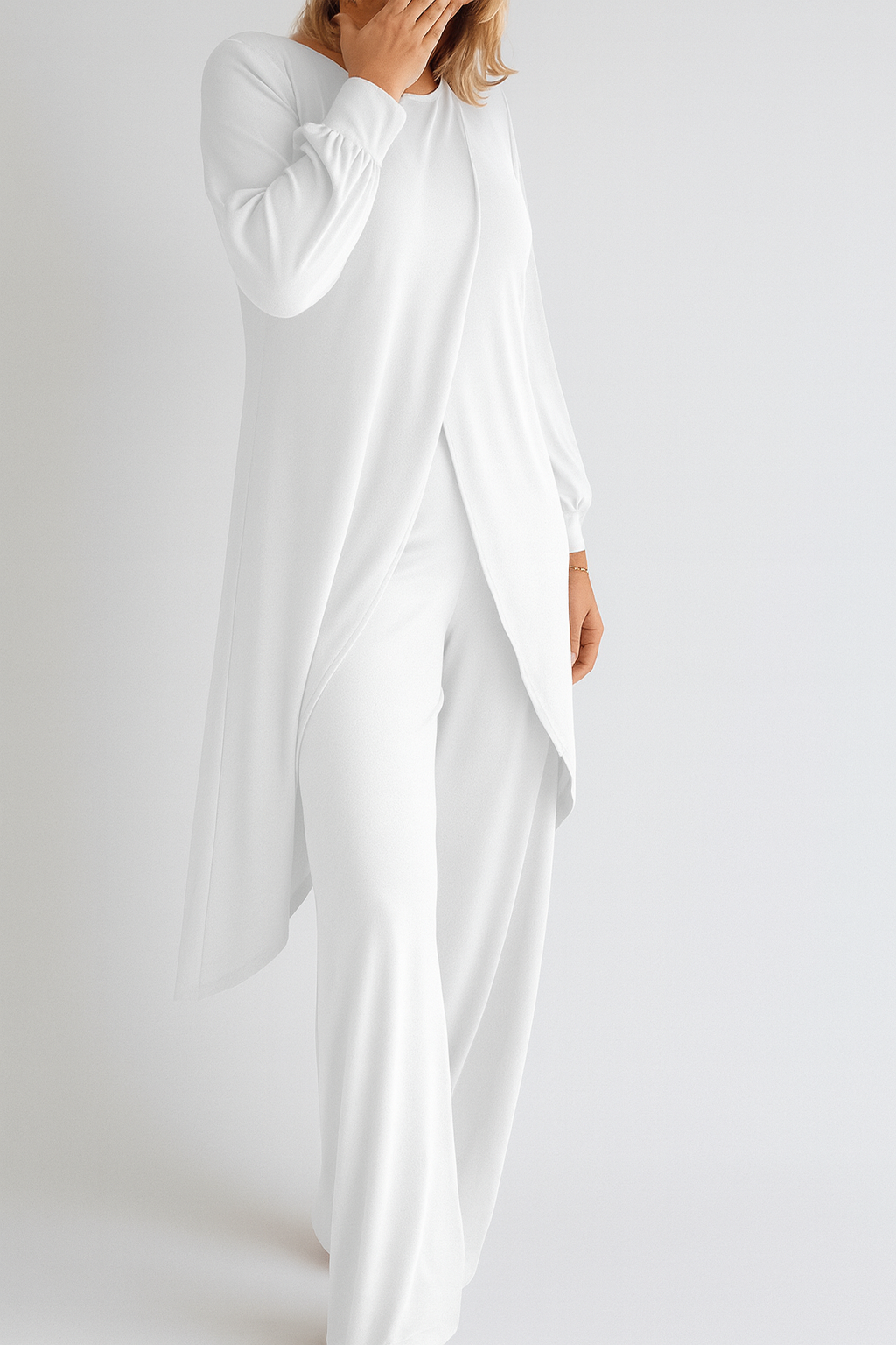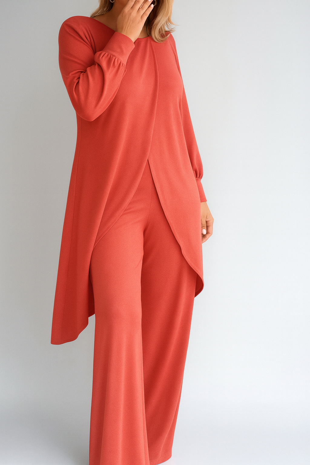 - Eleganter Crossover-Saum: Der lange, fließende Saum bietet zusätzliche Abdeckung und einen stilvollen, modernen Look.